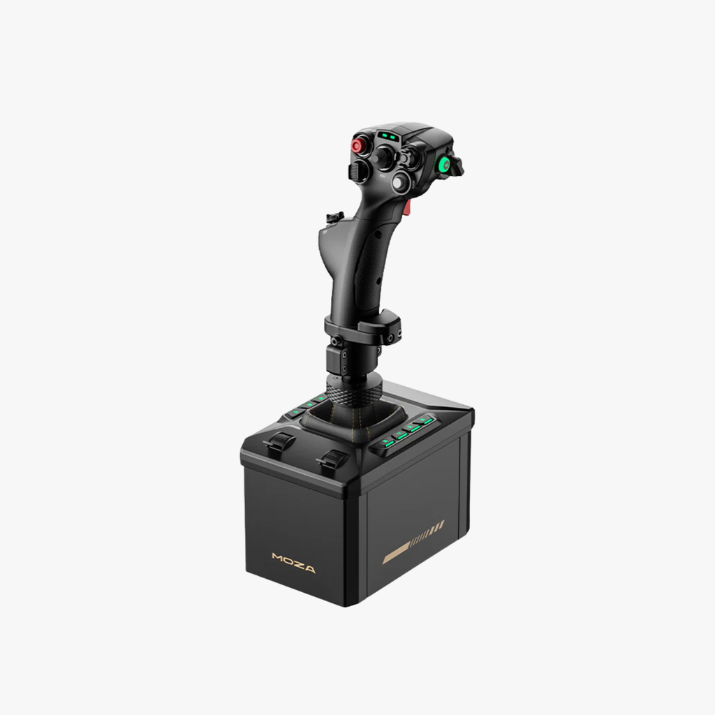 MOZA AB6バンドルは、高トルク6N·mのフォースフィードバックベースと高精度MHGフライトスティックを組み合わせ、正確なフォースフィードバック、29種類のプログラム可能な信号、そして臨場感あふれる飛行制御を実現します。宇宙船にインスパイアされたコンパクトなデザインは、デスクトップクランプ(付属)、オプションのベースプレート、または直接ハードマウントに対応しており、コックピットやデスクトップのあらゆるセットアップに対応します。MOZAおよび一部のサードパーティ製フライトスティック、そして主要なフライトシミュレーターと互換性があります。